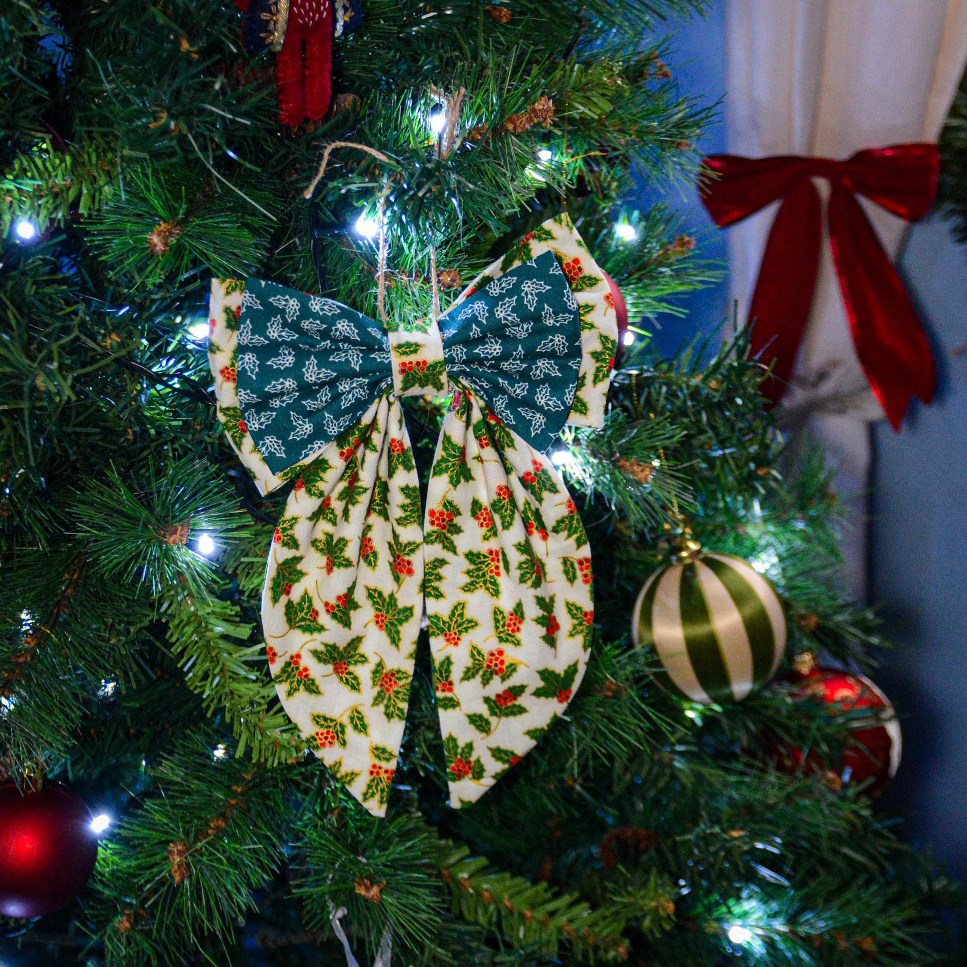 Apportez une touche de charme authentique à votre décoration de Noël avec ce nœud décoratif entièrement fait main. Réalisé dans un tissu aux motifs hivernaux délicats – de houx vert et rouge souligné de doré avec un double nœud au houx sur fond vert bouteille, il évoque la chaleur d’un Noël traditionnel.