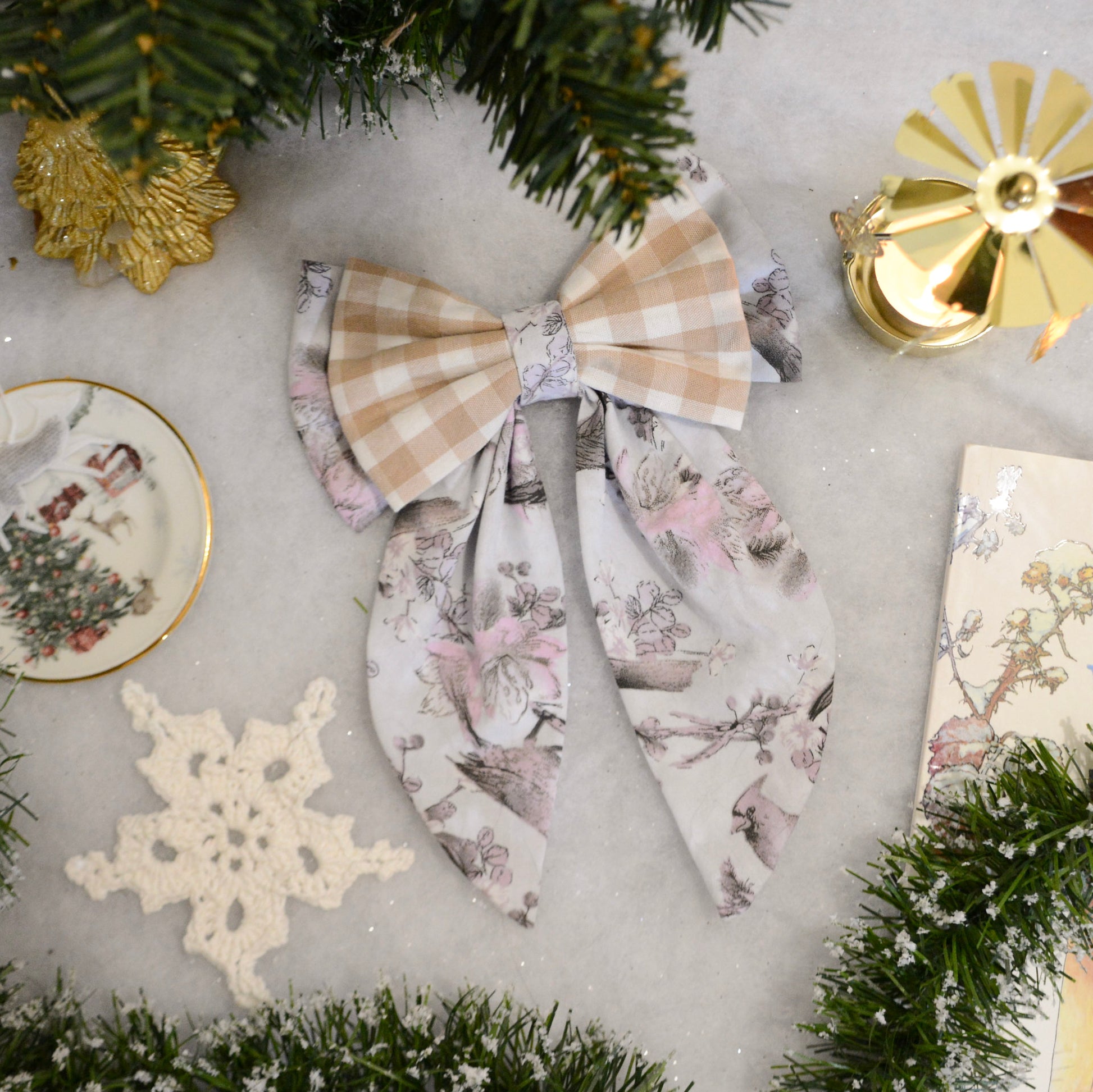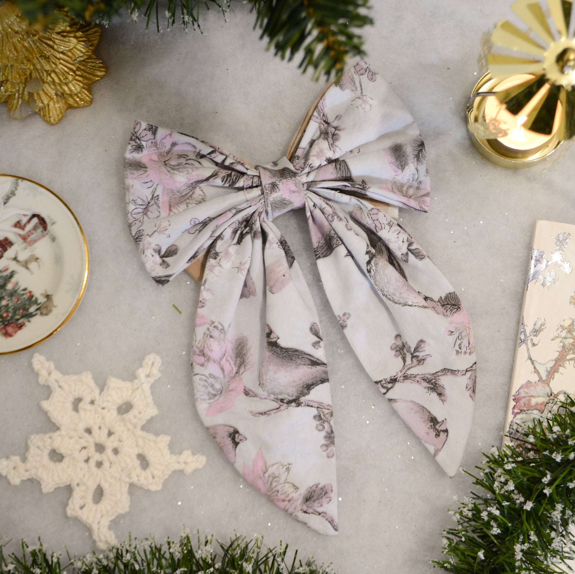 Tissu à motifs hivernaux : aux accents bleu et de délicats oiseaux pour le nœud principal avec un double nœud à carreaux beiges.